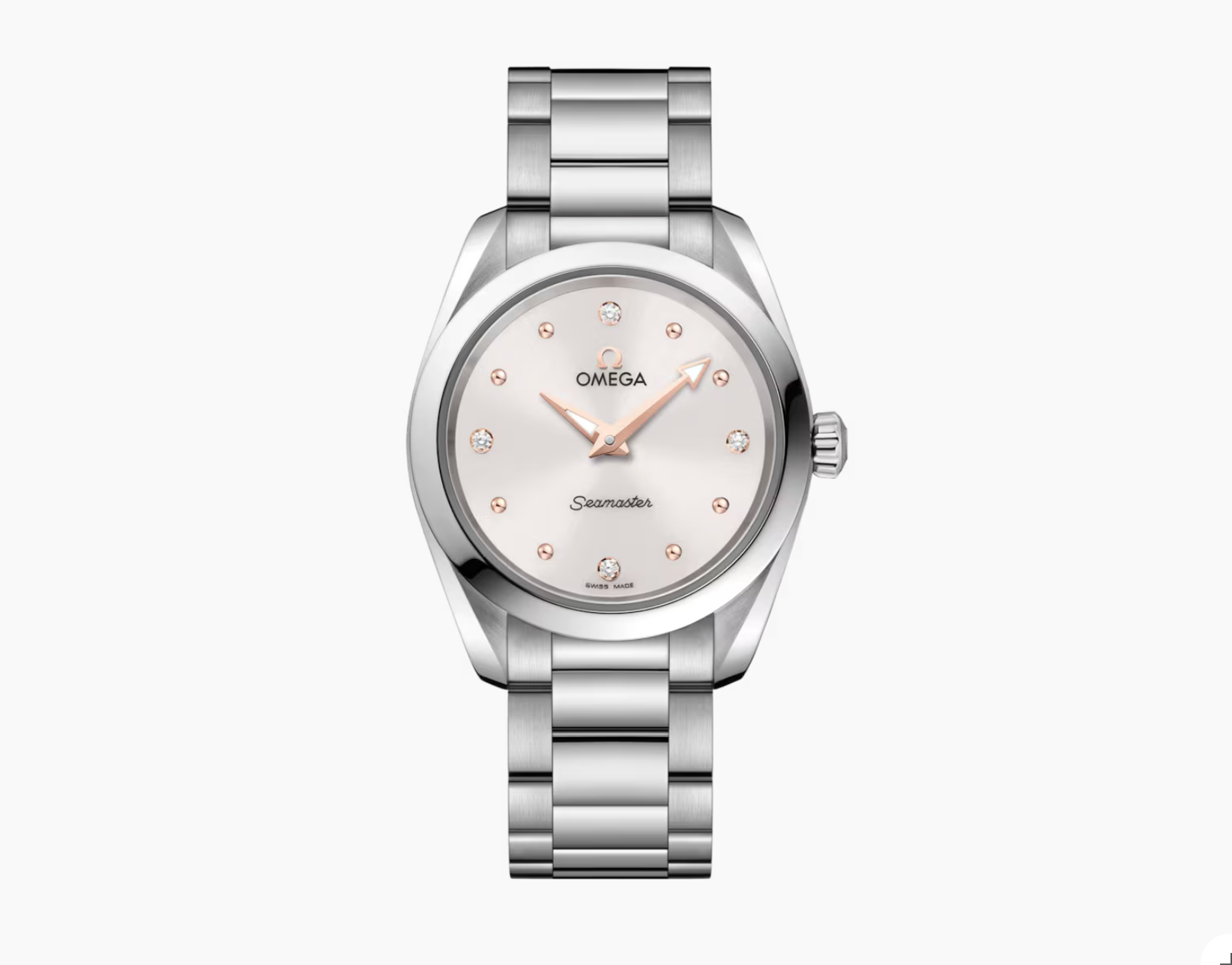 The watch is presented on an integrated stainless steel bracelet and is driven by the OMEGA Calibre 4061.