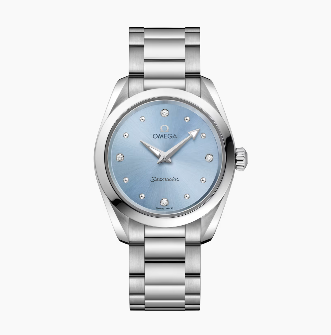 With a symmetrical 28 mm case, this stainless steel model features a glossy ice blue dial, 8 dotted rhodium-plated indexes and 4 diamond indexes in rhodium-plated holders. The hands are also rhodium-plated and the caseback is embossed with the OMEGA Seahorse on a wavy background.